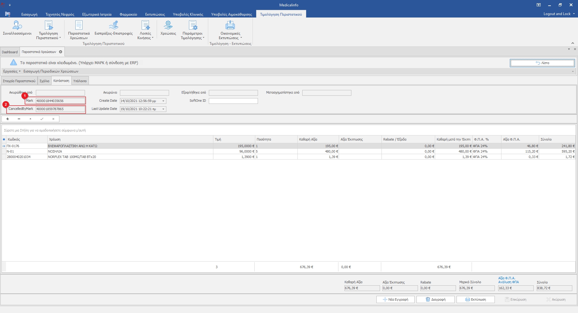 Μετά την ολοκλήρωση της διαδικασίας ακύρωσης διαβιβασμένου παραστατικού, εντός του παραστατικού στα Παραστατικά Χρεώσεων, εκτός του Μαρκ Διαβίβασης(1) υπάρχει καταχωρημένο και το Ακυρωτικό Μαρκ(2).