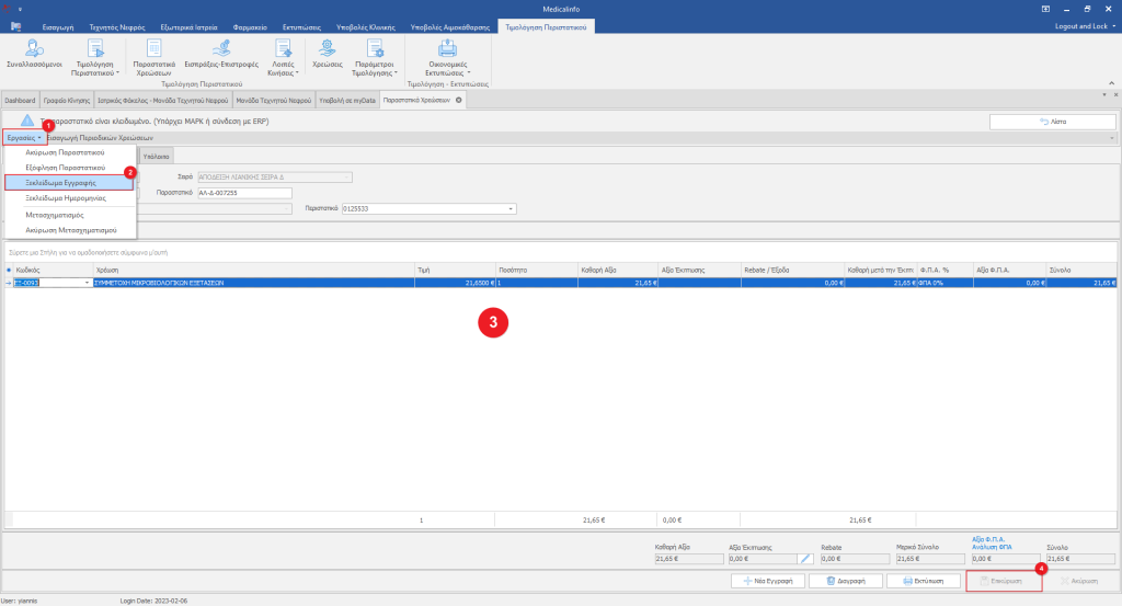 Αν επιθυμούμε να χρησιμοποιήσουμε την επαναποστολή σε Mydata θα χρειαστεί αρχικά να επεξεργαστούμε το παραστατικό. Εντός του παραστατικού κάνουμε κλικ στο κουμπί Εργασίες(1), στο drop-down μενού επιλέγουμε Ξεκλείδωμα Εγγραφής(2). Πραγματοποιούμε τις αλλαγές(3) που επιθυμούμε και τέλος Επικυρώνουμε(4).