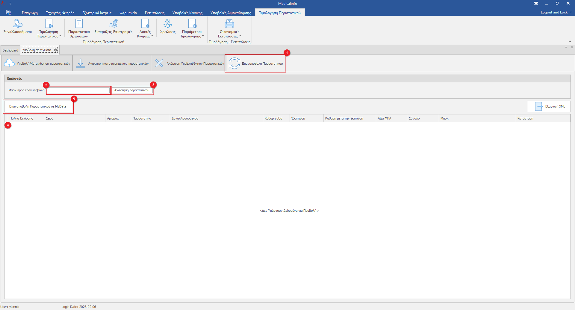Στο Μενου Υποβολή σε myData κάνουμε κλικ στην καρτέλα Επανυποβολή Παραστατικού(1), συμπληρώνουμε το Μαρκ του παραστατικού που επεξεργαστήκαμε στο πεδίο Μαρκ προς Επανυποβολή(2) και κάνουμε κλικ στο κουμπί Ανάκτηση παραστατικού(3). Αν έχουμε συμπληρώσει σωστά το Μαρκ θα εμφανιστούν όλα τα στοιχεία του παραστατικού στη λίστα(4), το επιλέγουμε και κάνουμε κλικ στο κουμπί Επανυποβολή Παραστατικού σε Mydata.