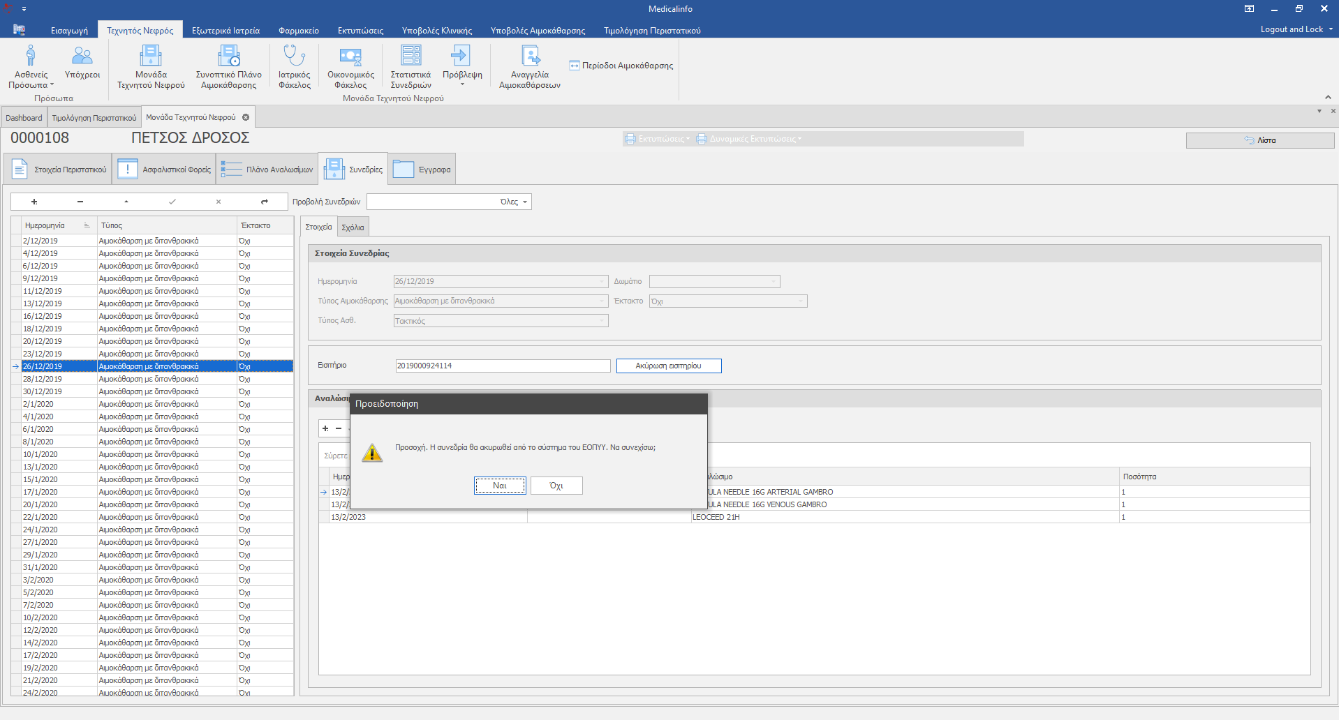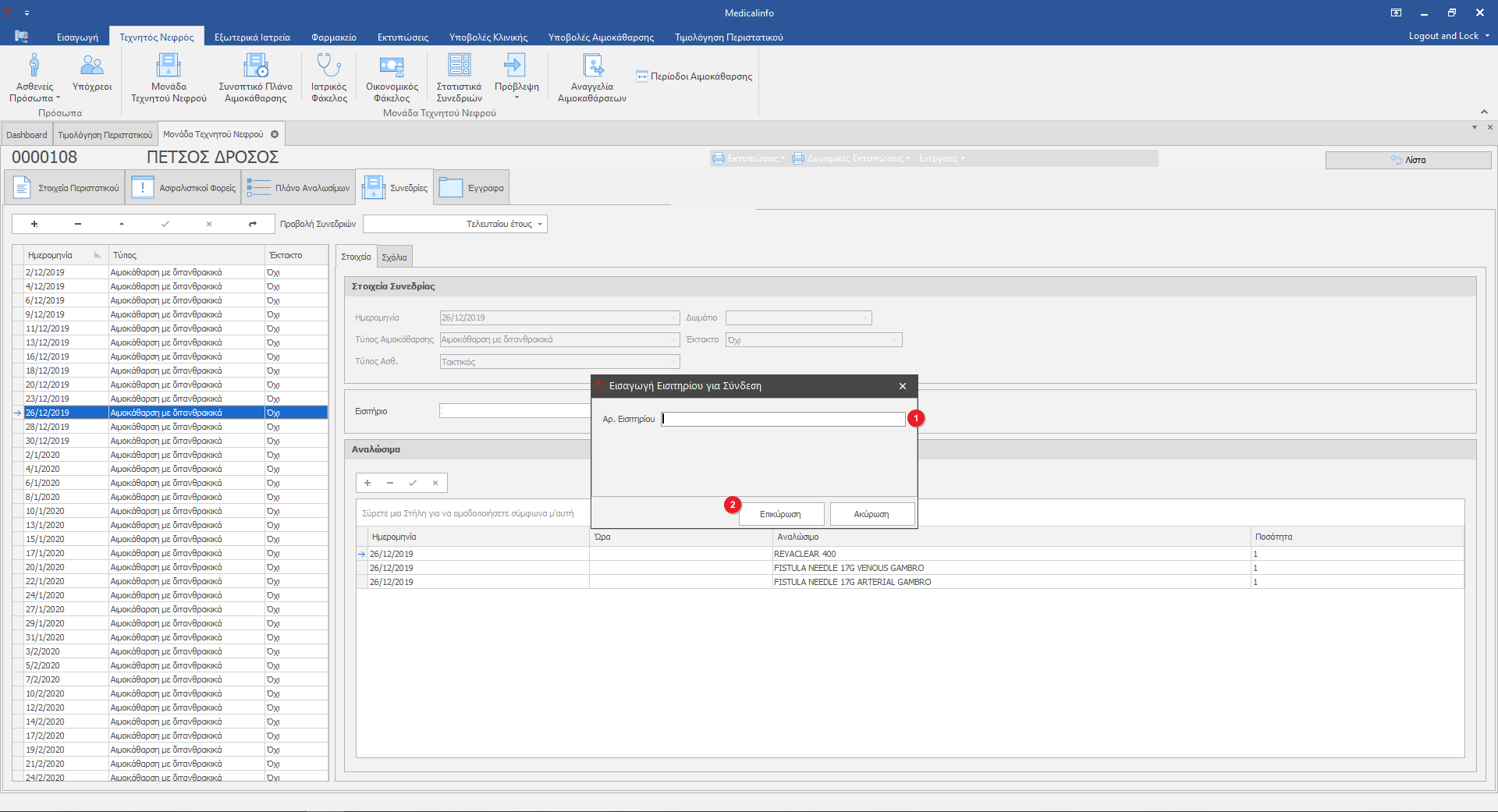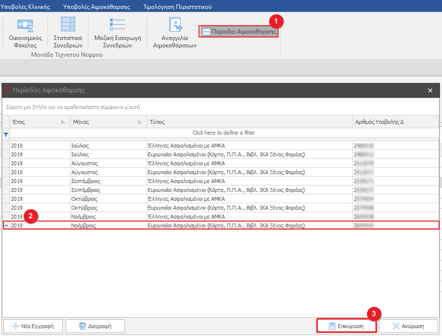 Για να δημιουργήσουμε Νέα Περίοδο Αιμοκάθαρσης κλικάρουμε το κουμπί Περίοδοι Αιμοκάθαρσης(1), στο pop- up παράθυρο κλικάρουμε το κουμπί Νέα Εγγραφή, συμπληρώνουμε τα απαραίτητα στοιχεία και Επικυρώνουμε(3).