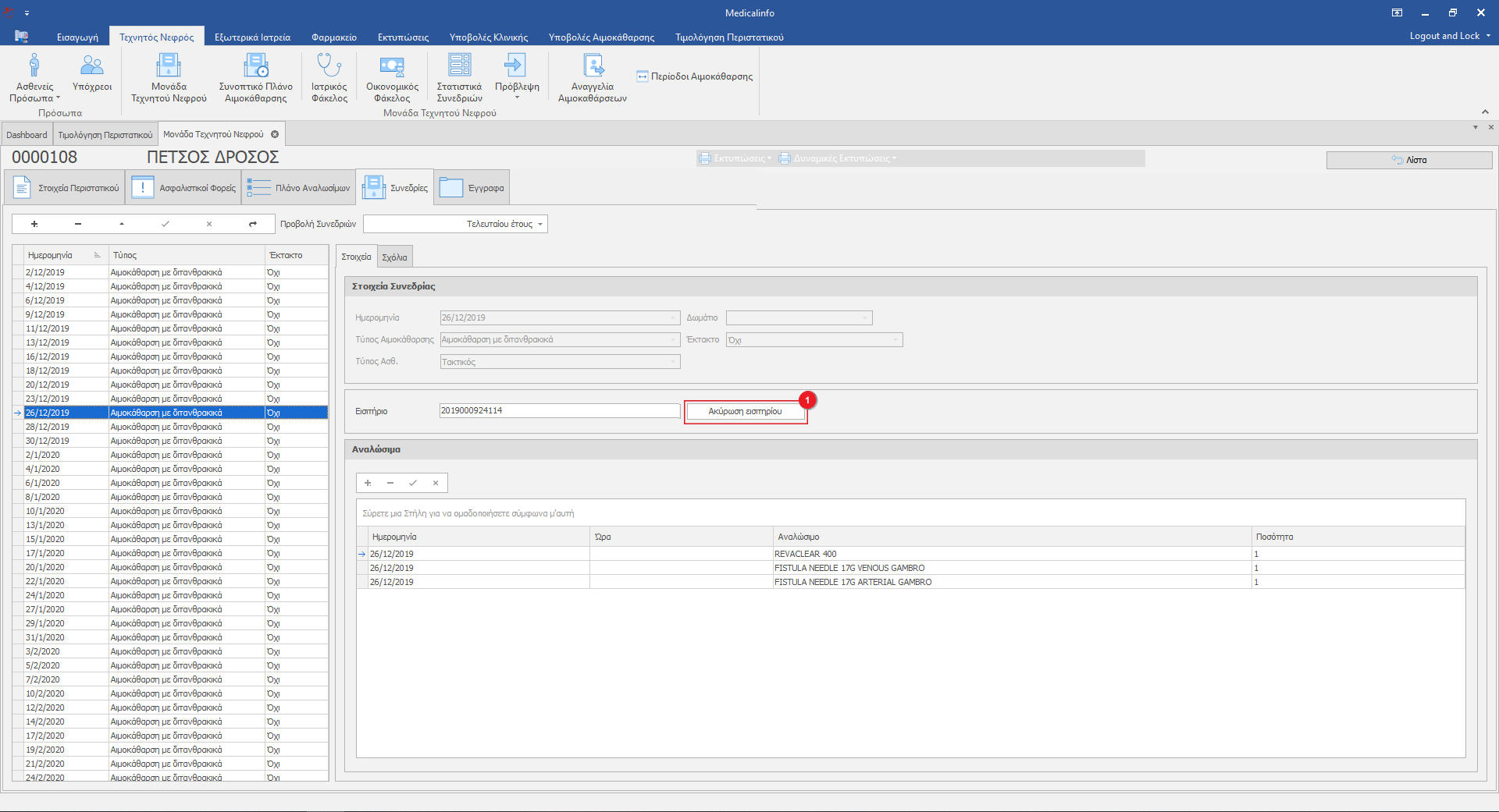Για να ακυρώσουμε την αναγγελία της συνεδρίας στον ΕΟΠΥΥ και να "ξεκλειδώσει" η εγγραφή, ώστε να μπορούμε να την επεξεργαστούμε κάνουμε κλικ στο κουμπί Ακύρωση εισιτηρίου(1).