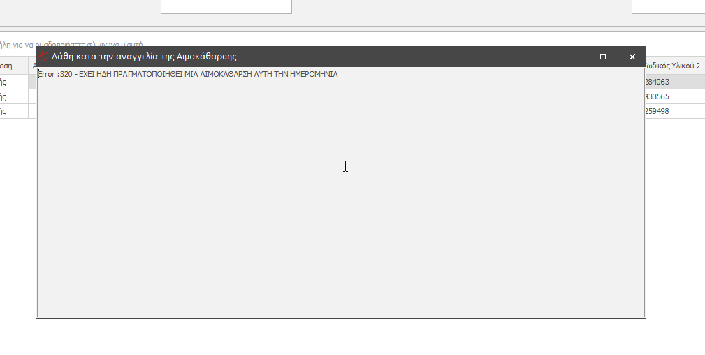 Σε περίπτωση που είναι αποτυχής κλικάρουμε τις τρεις τελείες και ανοίγει το παράθυρο <Λάθη κατά της αναγγελία της αιμοκάθαρσης > όπως βλέπουμε και παρακάτω.