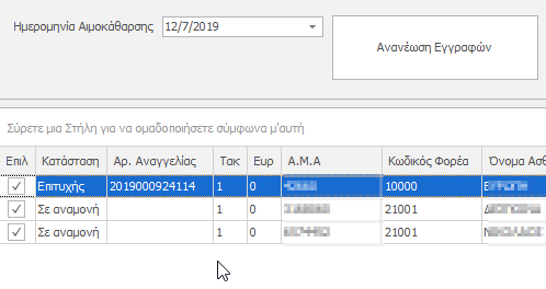 Αφού διορθώσουμε το λάθος κάνουμε Ανανέωση Εγγραφών ξανά, επιλέγουμε τον ασθενή και ξανά κάνουμε Αναγγελία .