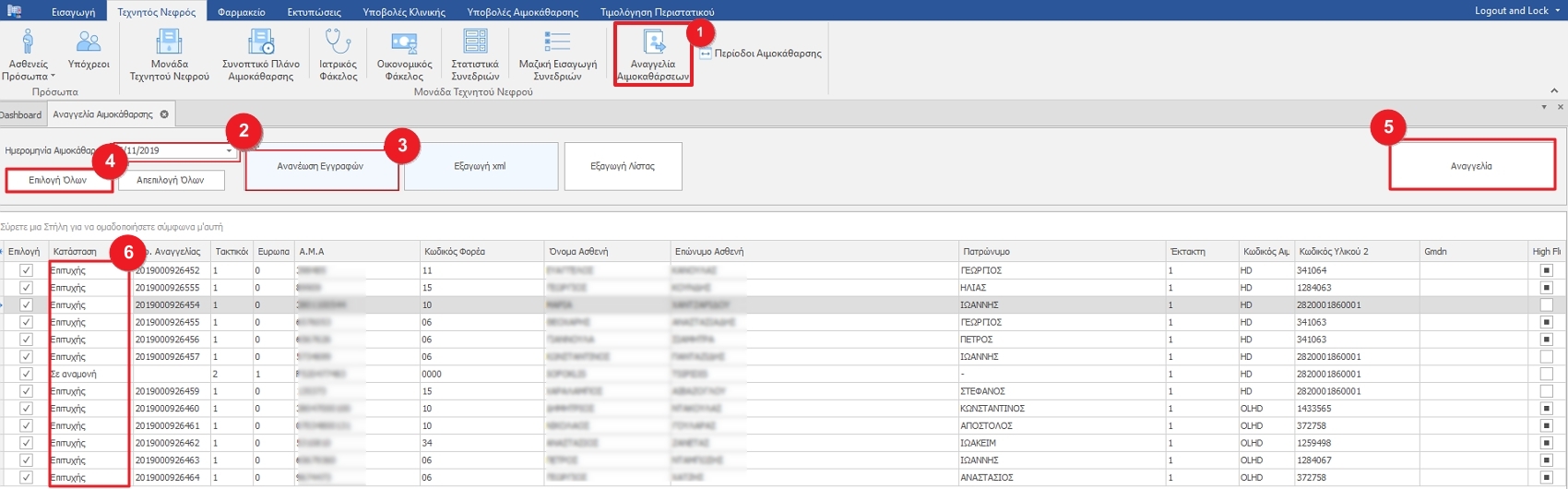 Στο μενού Τεχνητός Νεφρός κλικάρουμε το κουμπί Αναγγελία Αιμοκαθάρσεων(1). Συμπληρώνουμε την Ημερομηνία Αιμοκάθαρσης(2) και κλικάρουμε την Ανανέωση Εγγραφών(3). Αν πραγματοποιηθούν όλες οι συνεδρίες κλικλαρουμε το Επιλογή Όλων(4) αλλιώς επιλέγουμε τις συνεδρίες που επιθυμούμε. Τέλος κλικάρουμε το κουμπί Αναγγελία(5) και αναμένουμε την αλλαγή της Κατάστασης(6) σε Επιτυχής.