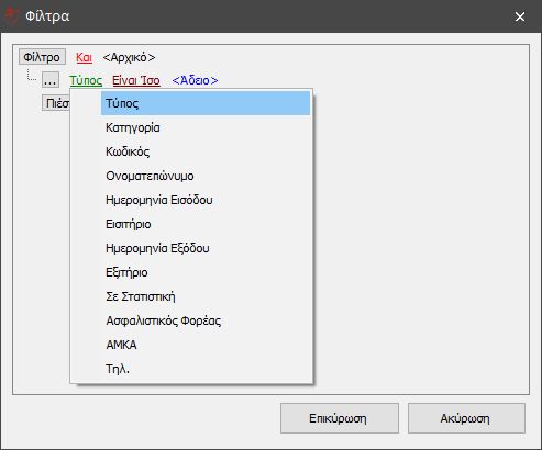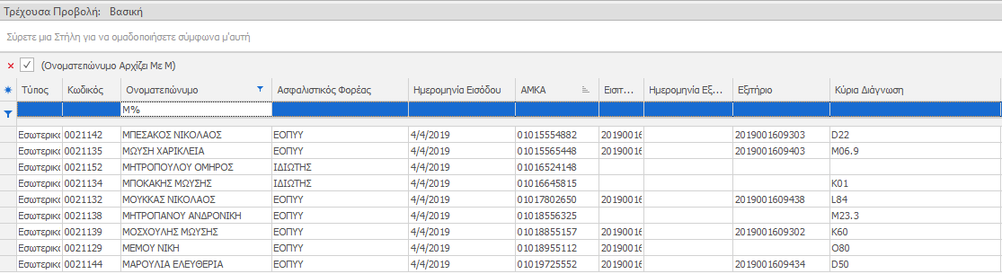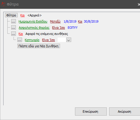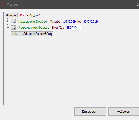 Στο προηγούμενο παράδειγμα για να εμφανίσουμε όλους τους ασθενείς με ημερομηνία εισόδου 1-30/8 και ασφαλιστικό φορέα τον ΕΟΠΥΥ τότε προσθέτουμε άλλη μία συνθήκη και προσθέτουμε εκτός από το εύρος ημερομηνιών εισόδου και τον ασφαλιστικό φορέα.