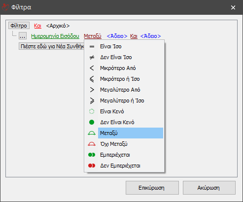 Έχοντας επιλέξει το κύκλωμα (πχ Ημερομηνία Εισόδου), τελεστή (Μεταξύ) στη συνέχεια προσθέτουμε στα κενά της επιθυμητές τιμές (ημερομηνίες).