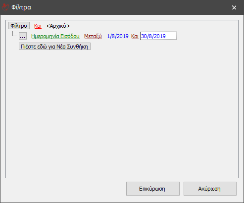 Η παραπάνω αναζήτηση θα μας εμφανίσει όλες τις εγγραφές που ως ημερομηνία εισόδου έχουν το διάστημα 1 μέχρι 30 Αυγούστου.