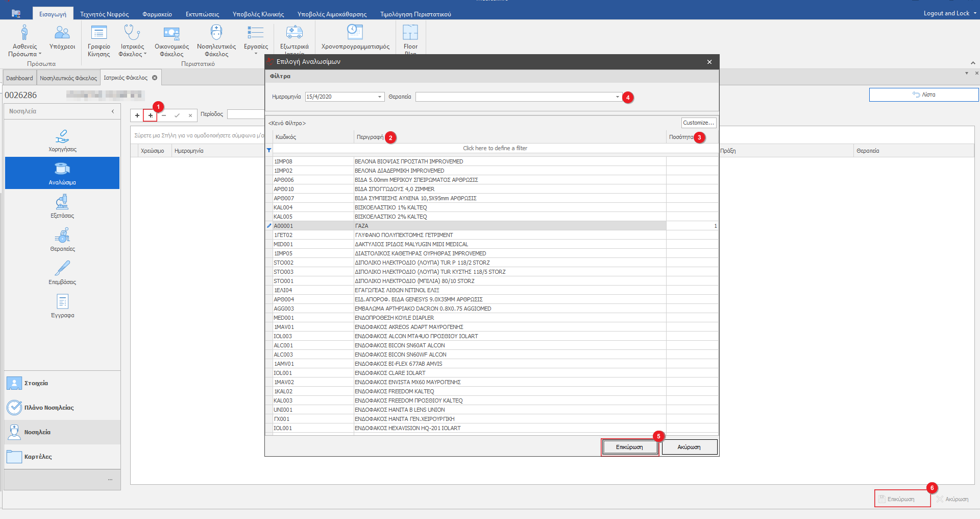 Όταν ολοκληρώσουμε με την εισαγωγή αναλωσίμων κάνουμε κλικ Επικύρωση(5) στο παράθυρο επιλογής και τέλος επικυρώνουμε την καρτέλα Αναλώσιμα(6).