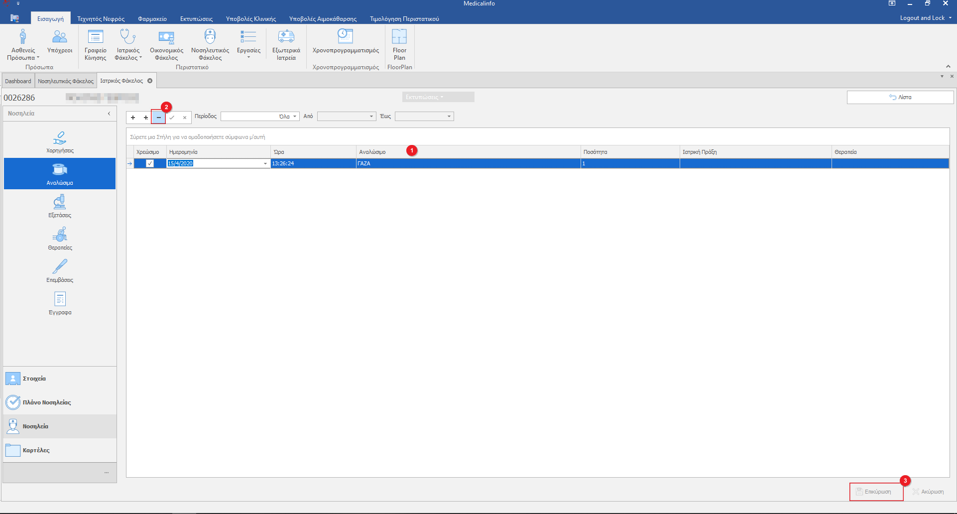 Από την καρτέλα Νοσηλεία(1) του μενού Ιατρικός Φάκελος επιλέγουμε Αναλώσιμα(2).