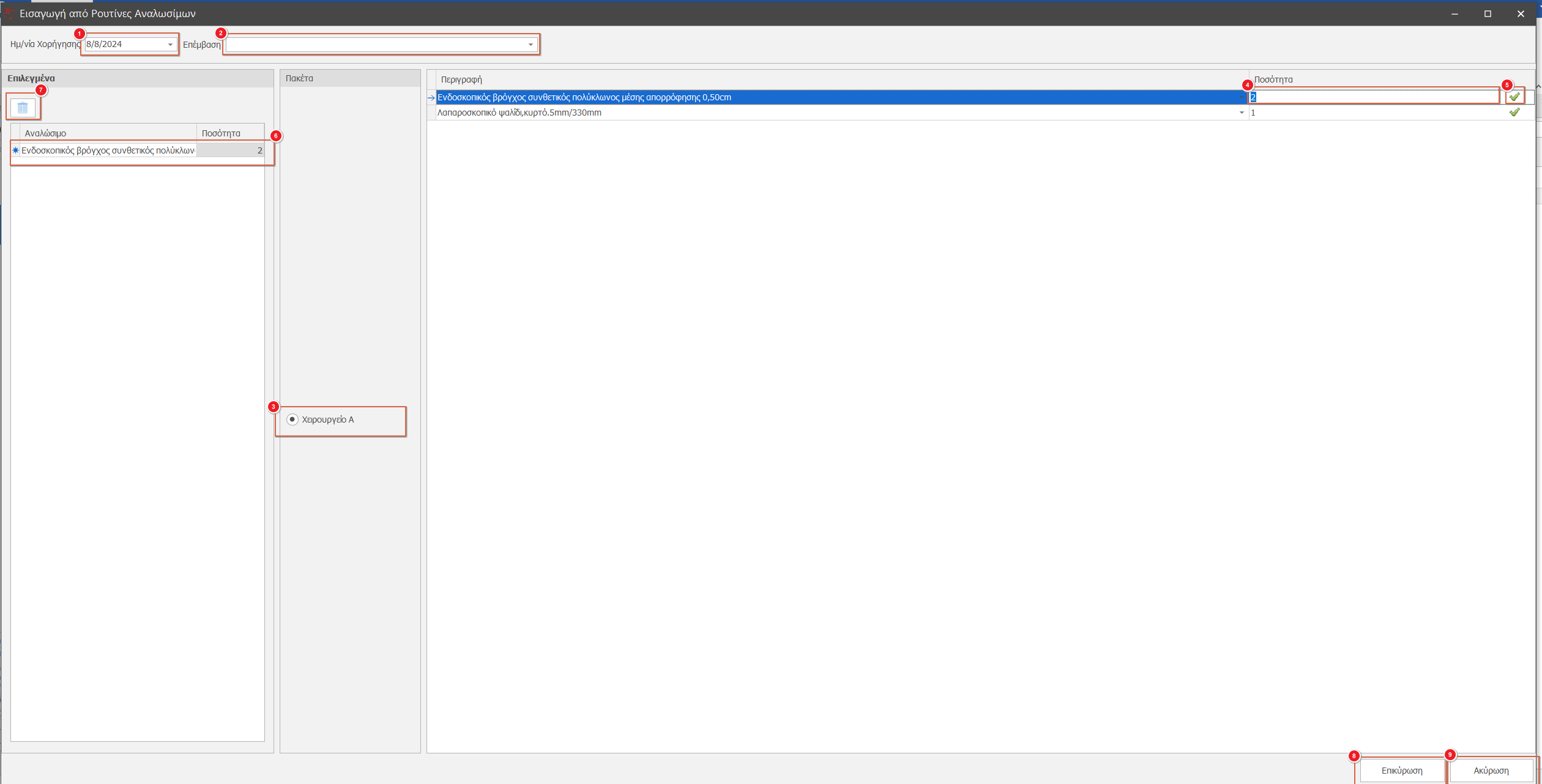 Στο αναδυόμενο παράθυρο επιλέγουμε Ημερομηνία(1), αν έχει καταχωρηθεί επέμβαση την επιλέγουμε το πεδίο Επέμβαση(2) και η ημερομηνία συμπληρώνεται αυτόματα με βάσει την ημερομηνία της επέμβασης. Στη συνέχεια επιλέγουμε από ποιο πακέτο(3) θα εμφανιστούν τα αναλώσιμα. Αν θέλουμε να αλλάξουμε την προεπιλεγμένη ποσότητα κάνουμε την αλλαγή στο πεδίο Ποσότητα(4) και για εισαγωγή κάνουμε κλικ στο κουμπί με το σύμβολο "V"(5). Η επιλογή μας μπαίνει στην αριστερή στήλη(6), αν ήταν λάθος ή θέλουμε να τη διαγράψουμε κάνουμε κλικ στο κουμπί με τον κάδο(7). Για να αποθηκευτεί η εγγραφή κάνουμε κλικ στο κουμπί Επικύρωση(8) διαφορετικά αν θέλουμε να αναιρέσουμε την ενέργεια κάνουμε κλικ στο κουμπί Ακύρωση(9).