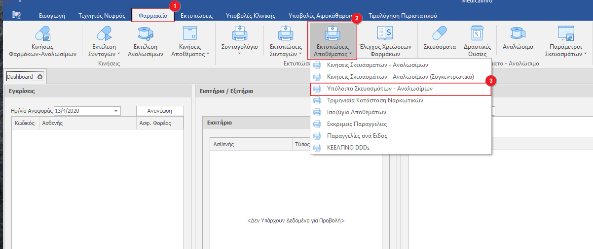 Από το Μενού Φαρμακείο(1) κάνουμε κλικ Εκτυπώσεις Αποθέματος(2) και επιλέγουμε Υπόλοιπα Σκευασμάτων- Αναλωσίμων(3).