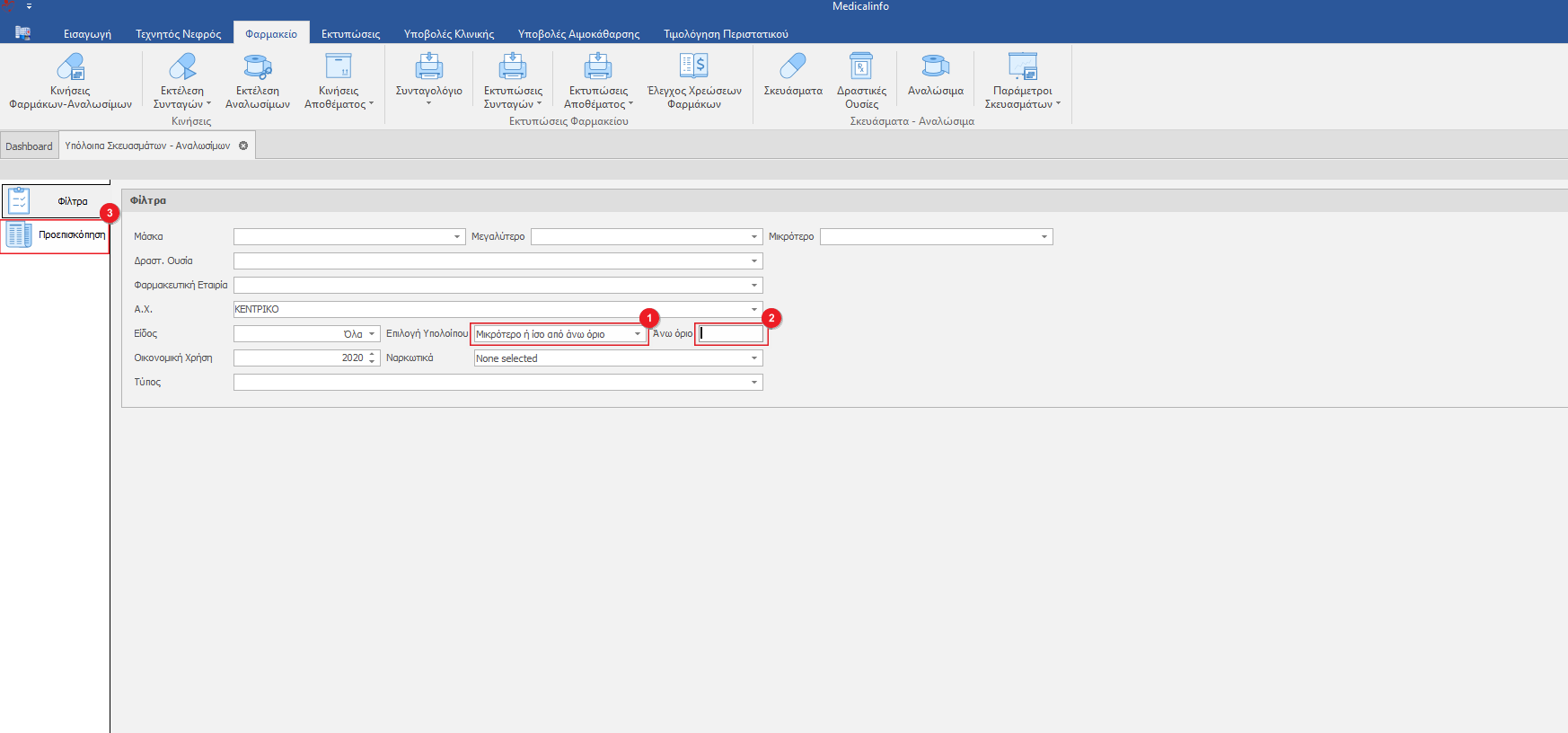 Αν επιθυμούμε να εμφανιστούν τα υπόλοιπα όλων των σκευασμάτων και αναλωσίμων τα οποία είναι κάτω από ένα όριο τότε επιλέγουμε Μικρότερο ή ίσο άνω όριο(1) και ορίζουμε το Άνω όριο(2). Επιλέγουμε Προεπισκόπηση(3) για να εμφανιστεί η εκτύπωση των υπολοίπων.
