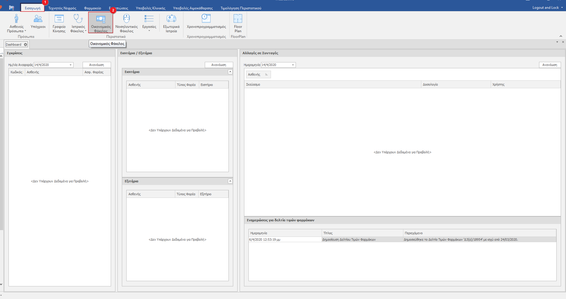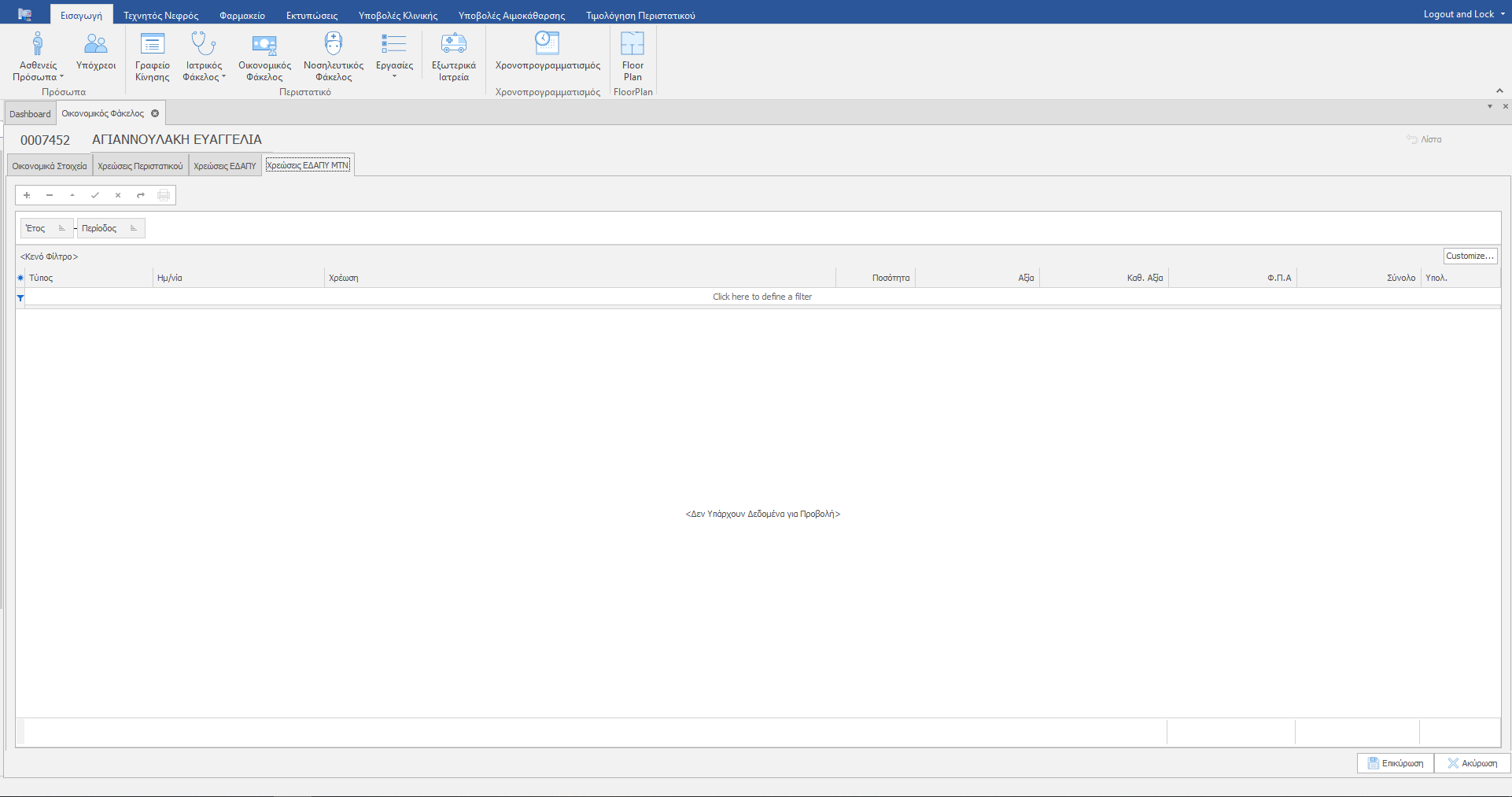 Πληροφορία: Αν ένα περιστατικό έχει κλείσει(έχει Εξιτήριο) τότε θα πρέπει να το αναζητήσουμε από τη λίστα περιστατικών της καρτέλας Οικονομικός Φάκελος.Ο μηχανισμός Αναζήτησης Περιστατικού περιγράφεται εδώ