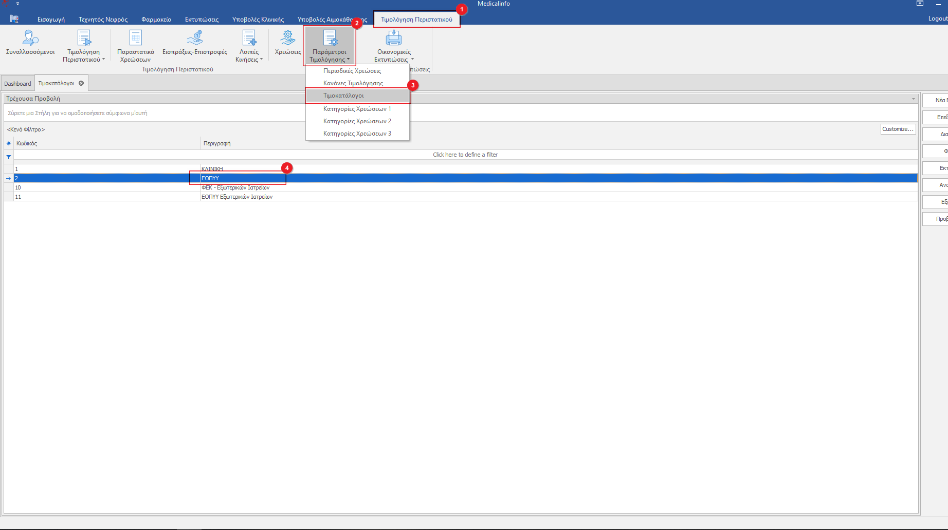 Κάνουμε κλικ από το Μενού Τιμολόγηση Περιστατικού(1) στο υπομενού Παράμετροι Τιμολόγησης(2) και από τη λίστα επιλέγουμε Τιμοκατάλογοι(3). Από τη λίστα που μας εμφανίζεται επιλέγουμε την εγγραφή του ΕΟΠΥΥ(4) και είτε κάνουμε διπλό κλικ στην εγγραφή είτε αφού επιλέξουμε την εγγραφή πατάμε το κουμπί "επεξεργασία" που βρίσκεται στην δεξιά στήλη.