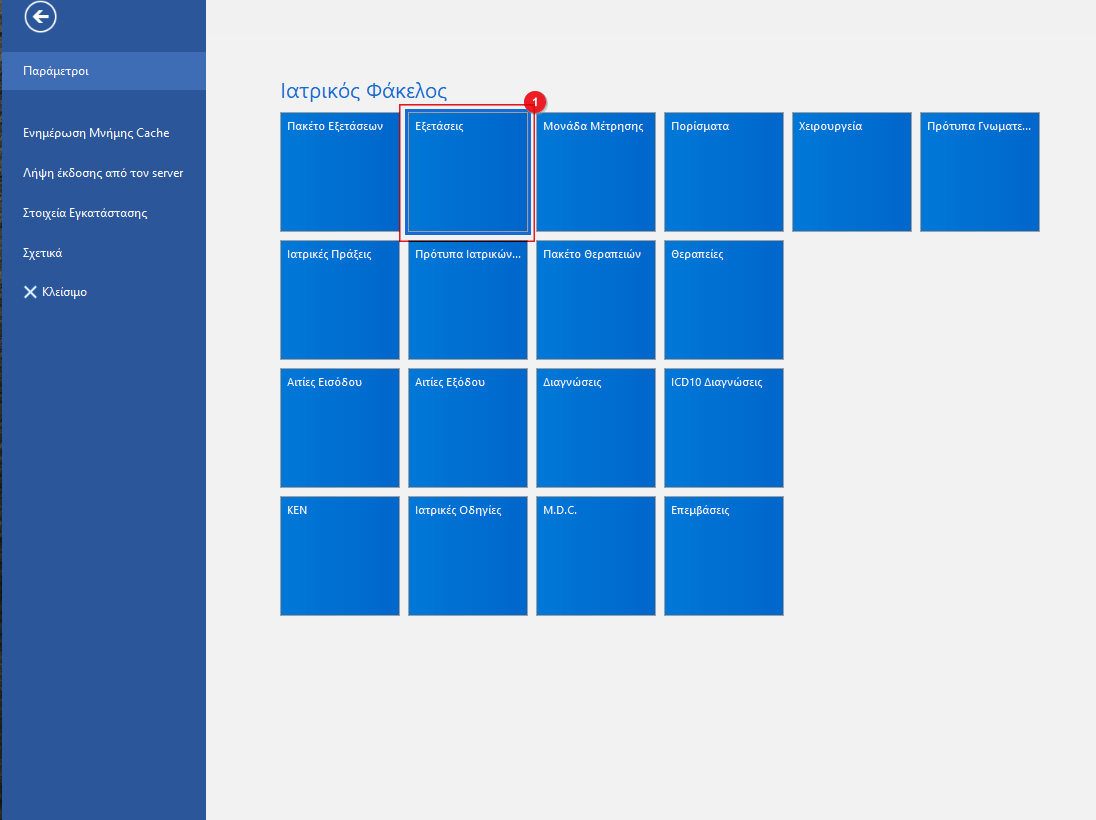 Από το μενού Ρυθμίσεων και την κατηγορία Ιατρικός Φάκελος κάνουμε κλικ στο κουμπί Εξετάσεις(1).