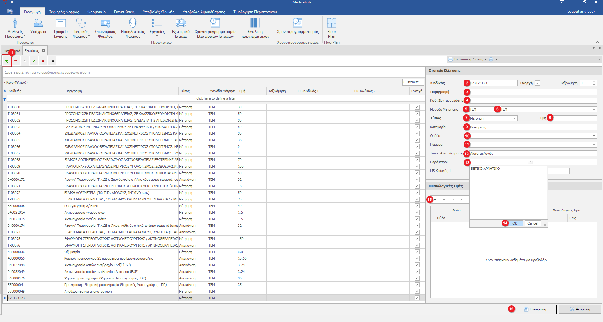 Ο μηχανισμός για να εισάγει τις εξετάσεις στον τιμοκατάλογο θα πρέπει απαραιτήτως να έχουμε συμπληρώσει κατά την δημιουργία των εξετάσεων τα πεδία των εξετάσεων Κωδικός και Τιμή Διαφορετικά δεν θα τα ενημερώσει. Δεδομένου πως στον ΕΟΠΥΥ αποστέλλονται μόνο οι εξετάσεις που έχουν 9ψήφιο κωδικό και τιμή.