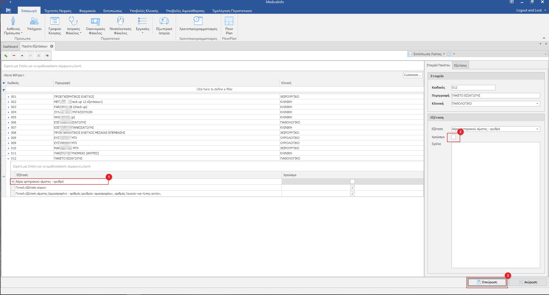 Για να να είναι χρεώσιμη μία εξέταση από το Πακέτο Εξετάσεων επιλέγουμε την εξέταση από το Πακέτο Εξετάσεων(1), κάνουμε κλικ στο check box Χρεώσιμο(2) και επικυρώνουμε(3). Επαναλαμβάνουμε τη διαδικασία για κάθε εξέταση του πακέτου.