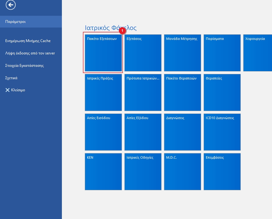 Από το Μενού Ρυθμίσεων και την κατηγορία Ιατρικός Φάκελος κάνουμε κλικ Πακέτο Εξετάσεων(1).