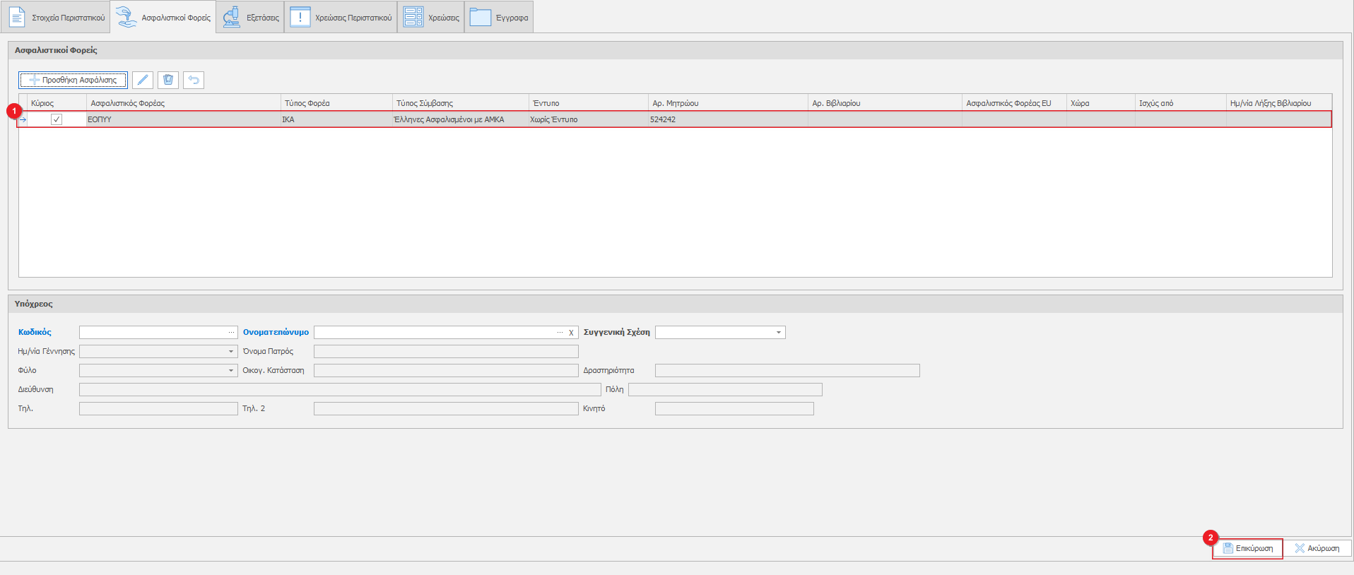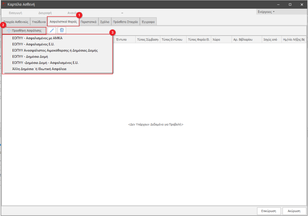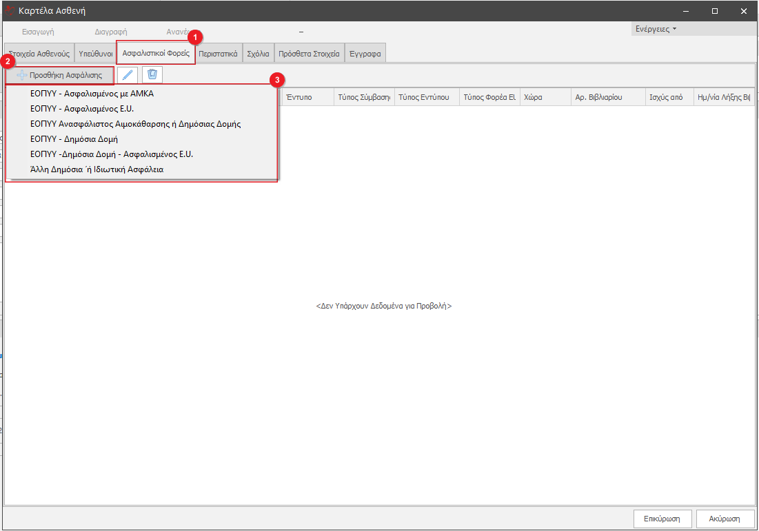 Έχουμε δημιουργήσει τα στοιχεία του Ασφαλιστικού Φορέα του Ασθενή- Περιστατικού(1) κάνουμε κλικ στο κουμπί Επικύρωση(2) για να αποθηκευτεί η καταχώρησή μας. Last updated on 27 Οκτωβρίου 2021
