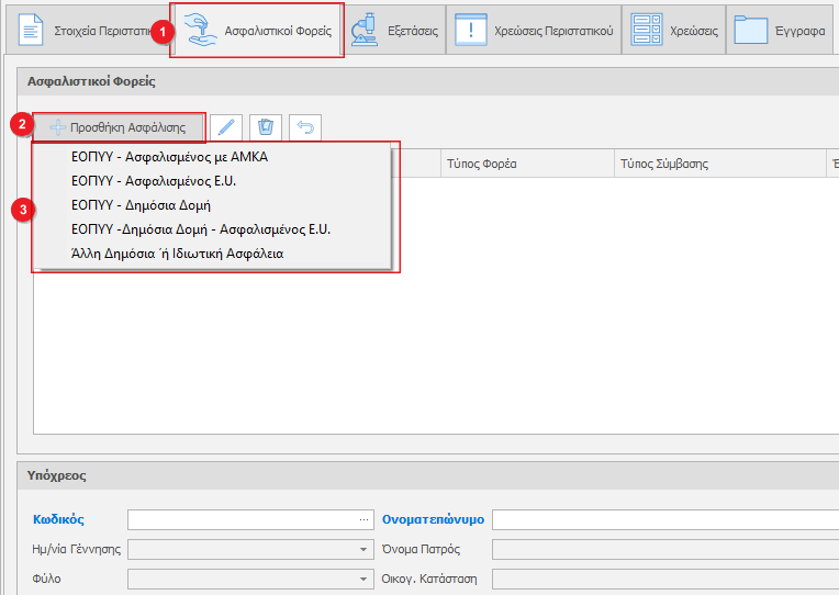 Τα βήματα καταχώρησης Ασφαλιστικού Φορέα, Ασθενή-Περιστατικού είναι τα παρακάτω: 1)Κάνουμε κλικ στην καρτέλα Ασφαλιστικοί Φορείς του Ασθενή ή του Περιστατικού. 2)Κάνουμε κλικ στο κουμπί +Προσθήκη Ασφάλισης. 3)Από το drop down μενού επιλέγουμε την κατηγορία ασφάλισης που επιθυμούμε.