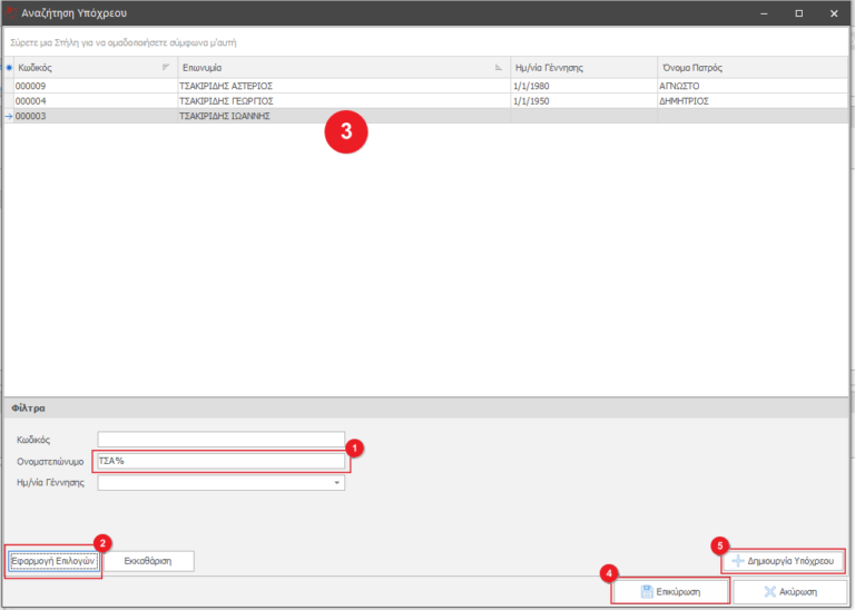 Στο αναδυόμενο παράθυρο αναζήτησης πληκτρολογούμε τα αρχικά γράμματα του επιθέτου και το σύμβολο "%" στο πεδίο Ονοματεπώνυμο(1). Κάνουμε κλικ στο κουμπί Εφαρμογή Επιλογών(2). Αν είναι ήδη καταχωρημένος ο Υπόχρεος ή το Πρόσωπο θα εμφανιστεί στη λίστα(3), τον επιλέγουμε και κάνουμε κλικ στο κουμπί Επικύρωση(4) για να προβάλουμε τα πλήρη στοιχεία του.