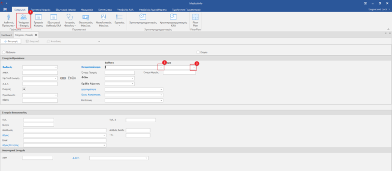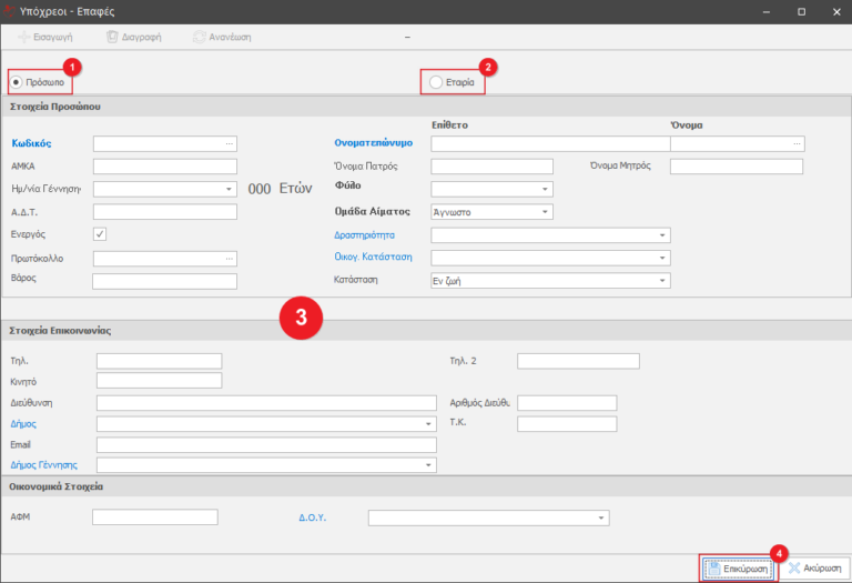 Από το κύριο μενού στην καρτέλα Εισαγωγή επιλέγουμε Υπόχρεοι-Πρόσωπα(1).
