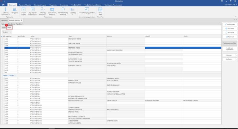 Αν έχουμε ενεργοποιήσει τη ρύθμιση "Χρήση πλάνου" η είσοδος στο περιστατικό μέσω του πλάνου(1) πραγματοποιείται με διπλό κλικ στο ονοματεπώνυμο του ασθενή.