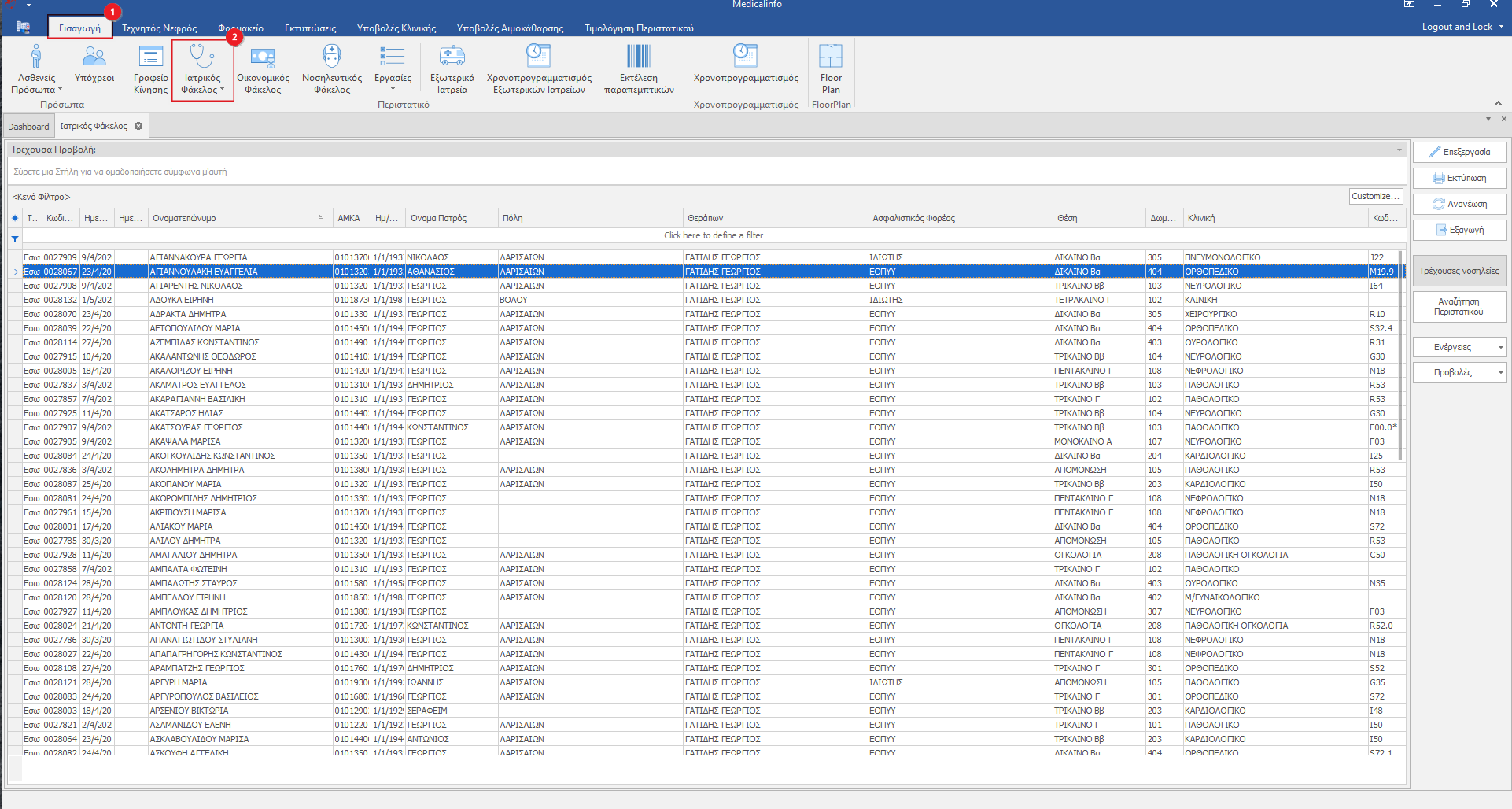 Η πρόσβαση στον ιατρικό φάκελο γίνεται μέσω του βασικού μενού Εισαγωγή(1) -> Ιατρικός Φάκελος(2).