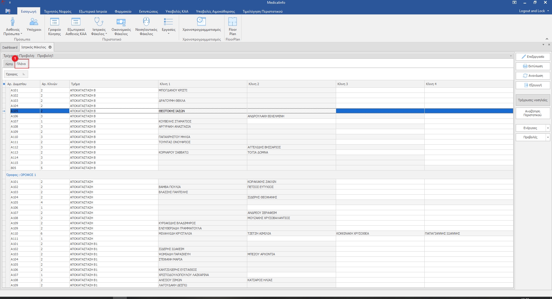 Αν έχουμε ενεργοποιήσει τη ρύθμιση "Χρήση πλάνου" η είσοδος στο περιστατικό μέσω του πλάνου(1) πραγματοποιείται με διπλό κλικ στο ονοματεπώνυμο του ασθενή.