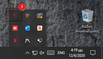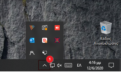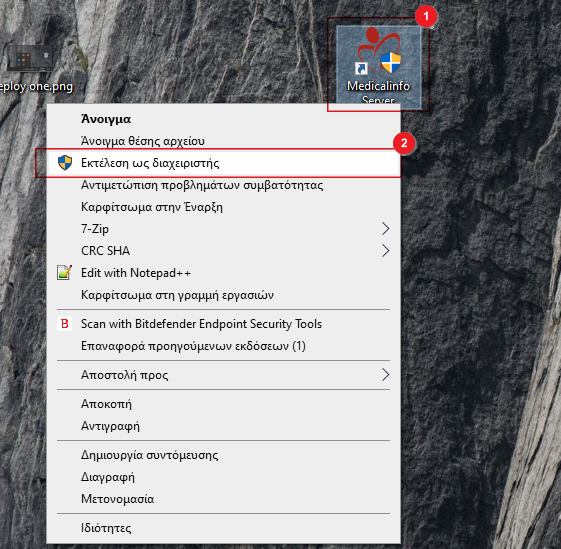 Πρώτα ελέγξτε αν ο Server της εφαρμογής ''λειτουργεί'' ήδη. Στο system tray των Windows πατήστε το βελάκι ^ (1). Αν δεν υπάρχει το εικονίδιο του MedicalInfo, όπως στην εικόνα, τότε ο Server της εφαρμογής δεν ''λειτουργεί''.  Πατήστε δεξί κλικ στο εικονίδιο Medicalinfo Server(1) και επιλέξτε Εκτέλεση ως διαχειριστής(2). Πατώντας ξανά στο system tray των Windows θα δείτε το εικονίδιο του Medicalinfo Server(1) Προσοχή! Η παραπάνω εργασία πραγματοποιείται σε περίπτωση που κάνει επανεκκίνηση ο Η/Υ στον οποίο ειναι εγκατεστημένος o Server και αν μας εμφανιστεί μήνυμα στην εφαρμογή ''Αδυναμία σύνδεσης με τον απομακρυσμένο διακομιστή'', αν μετά το συγκεκριμένο μήνυμα διαπιστώσετε ότι ο Server ''λειτουργεί'' σημαίνει ότι το πρόβλημα δημιουργείται από άλλη λειτουργία ή εφαρμογή π.χ. Firewall των Windows. Σε αυτή την περίπτωση θα πρέπει να επικοινωνήσετε με τον διαχειριστή του δικτύου σας.