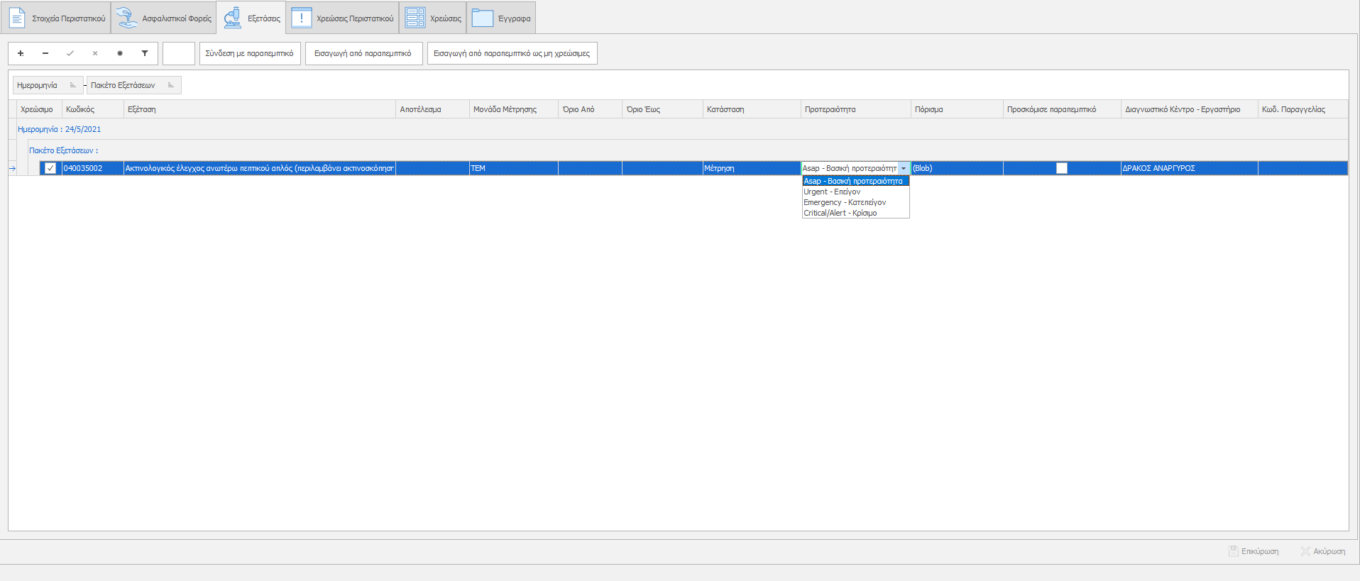 Στις καταχωρημένες εξετάσεις έχουμε τη δυνατότητα να ορίσουμε προτεραιότητα, τον Ιατρό που θα εκτελέσει την εξέταση και να αναγνώσουμε-εκτυπώσουμε-αποθηκεύσουμε το πόρισμα της εξέτασης.