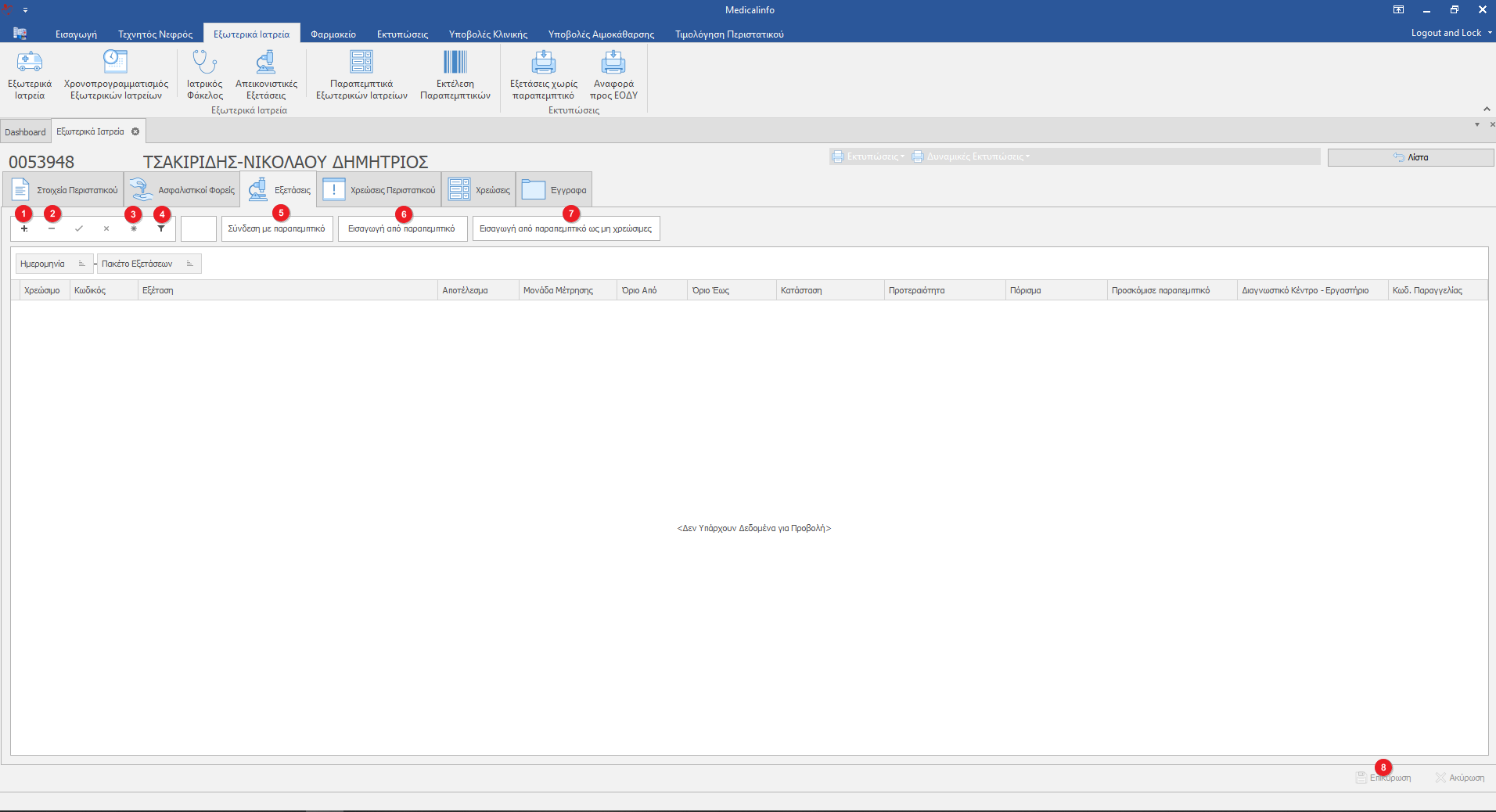 Στην καρτέλα Εξετάσεις εισάγουμε τις εξετάσεις του περιστατικού χειροκίνητα και μέσω παραπεμπτικού.