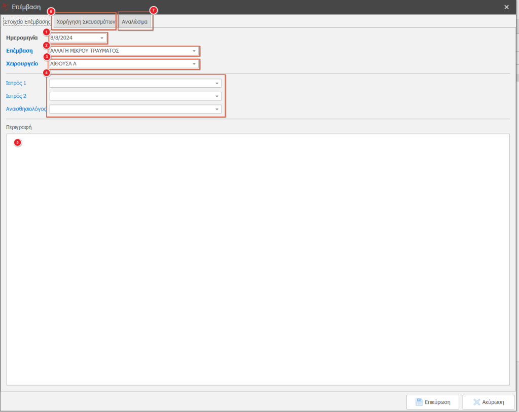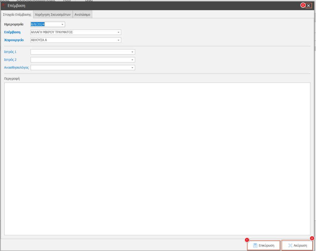 Αφού συμπληρώσουμε τα στοιχεία που επιθυμούμε κάνουμε κλικ το κουμπί Επικύρωση(1) για να αποθηκευτεί η Επέμβαση. Αν θέλουμε να ακυρώσουμε τις κινήσεις που πραγματοποιήσαμε κάνουμε κλικ στο κουμπί Ακύρωση(2) ή στο Χ(3) στο δεξί άνω άκρο του αναδυόμενου παραθύρου.