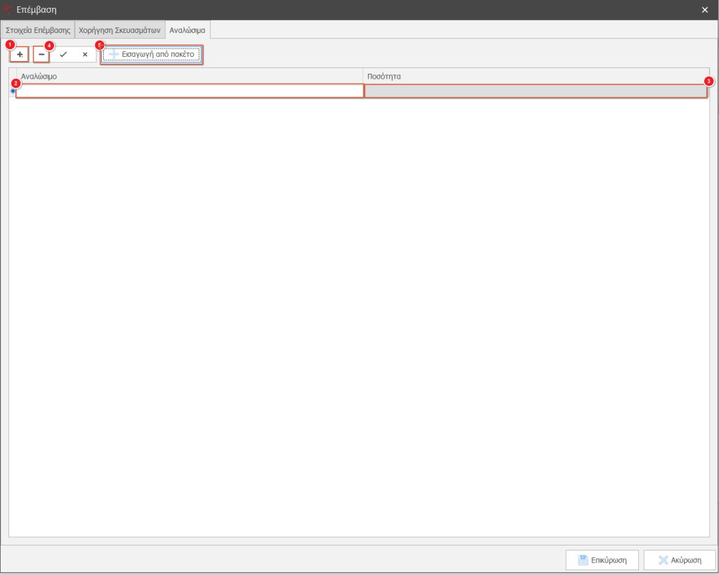 Στο αναδυόμενο παράθυρο Αναλώσιμα κάνουμε κλικ το κουμπί με το σύμβολο "+"(1) για την καταχώρηση νέου Αναλωσίμου, στη συνέχεια πληκτρολογούμε την περιγραφή του Αναλωσίμου(2) και την ποσότητα(3) που χρησιμοποιήθηκε. Για να διαγράψουμε ένα αναλώσιμο αφού το επιλέξουμε κάνουμε κλικ στο κουμπί με το σύμβολο"-"(4). Για εισαγωγή αναλωσίμων από πακέτο αναλωσίμων κάνουμε κλικ στο κουμπί "+Εισαγωγή από πακέτο"(5).