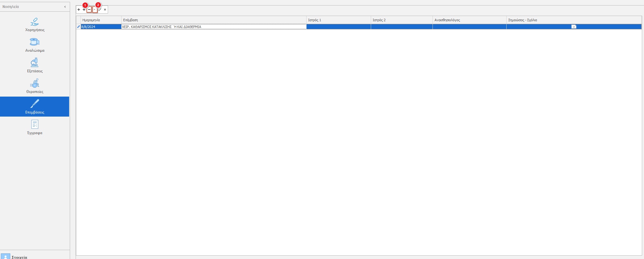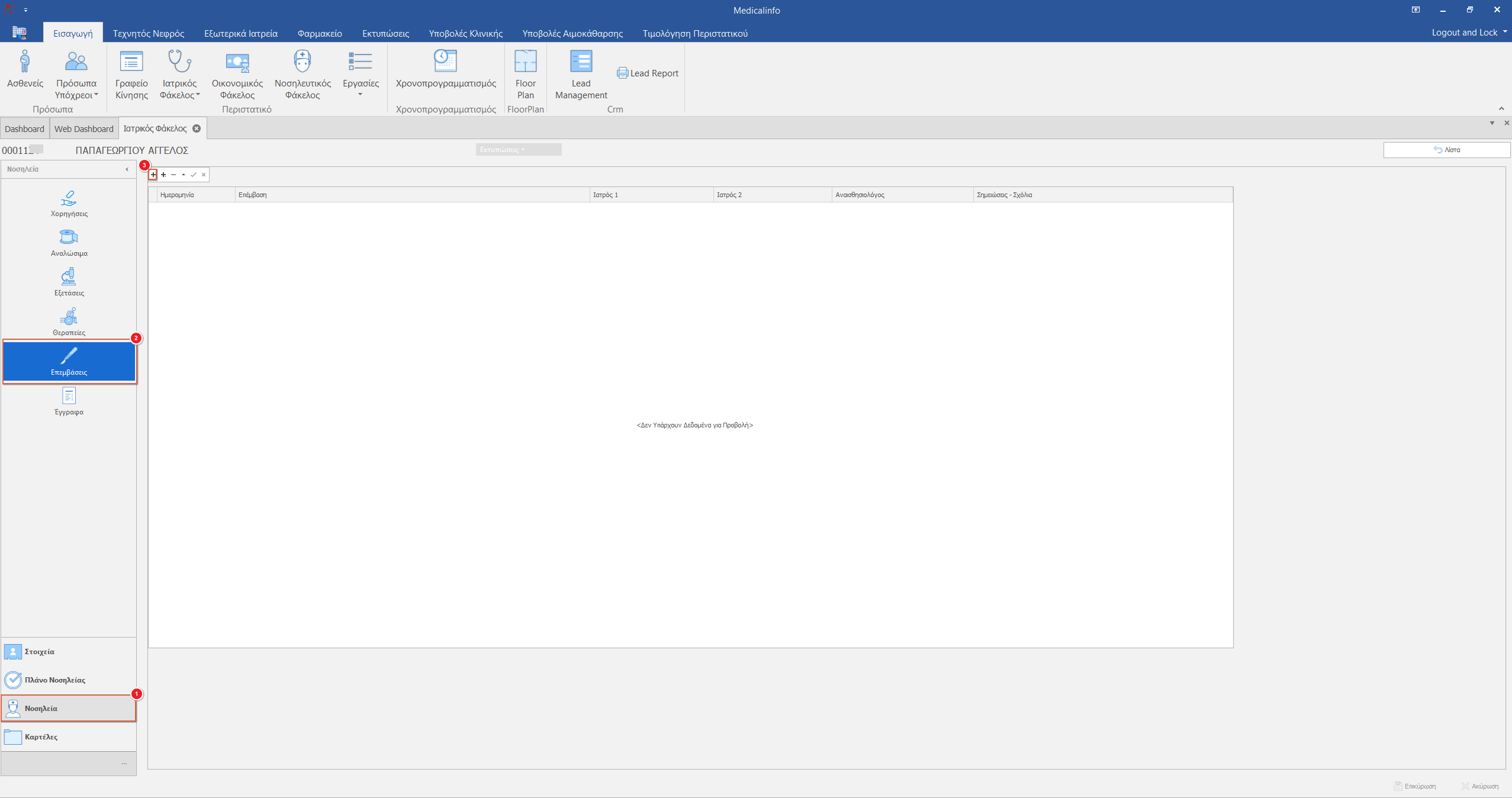 Για είσοδο στην καρτέλα Επεμβάσεις στο Ιατρικό Φάκελο του περιστατικού κάνουμε κλικ στο Μενού Νοσηλεία(1) και στη συνέχεια στην καρτέλα Επεμβάσεις(2). Για την καταχώρηση νέας επέμβασης κάνουμε κλικ στο κουμπί με το σύμβολο "+"(3).