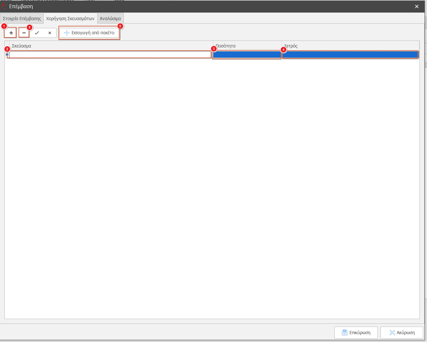 Στο αναδυόμενο παράθυρο Χορήγησης Σκευασμάτων κάνουμε κλικ το κουμπί με το σύμβολο "+"(1) για την καταχώρηση νέας χορήγησης, στη συνέχεια πληκτρολογούμε την περιγραφή του σκευάσματος(2), την ποσότητα(3) χορήγησης και προαιρετικά τον Ιατρό(4). Για να διαγράψουμε μία χορήγηση αφού την επιλέξουμε κάνουμε κλικ στο κουμπί με το σύμβολο"-"(5). Για εισαγωγή χορηγήσεων από πακέτο σκευασμάτων κάνουμε κλικ στο κουμπί "+Εισαγωγή από πακέτο"(6).