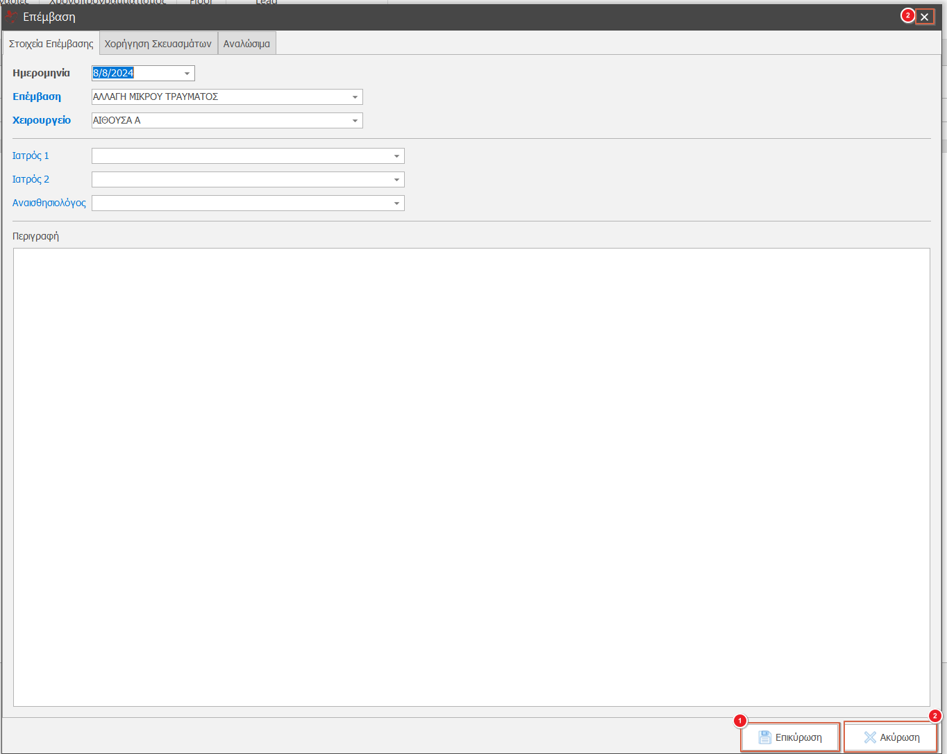 Αφού συμπληρώσουμε τα στοιχεία που επιθυμούμε κάνουμε κλικ το κουμπί Επικύρωση(1) για να αποθηκευτεί η Επέμβαση. Αν θέλουμε να ακυρώσουμε τις κινήσεις που πραγματοποιήσαμε κάνουμε κλικ στο κουμπί Ακύρωση(2) ή στο Χ(3) στο δεξί άνω άκρο του αναδυόμενου παραθύρου.