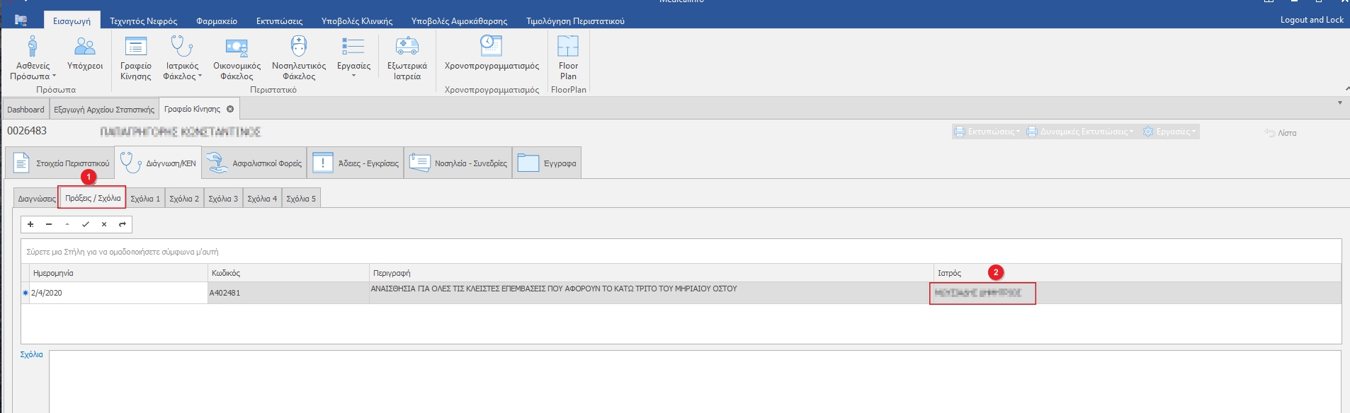 • Πράξεις (Εμφανίζει τα περιστατικά που έχει προστεθεί ιατρική πράξη στο γραφείο κίνησης)