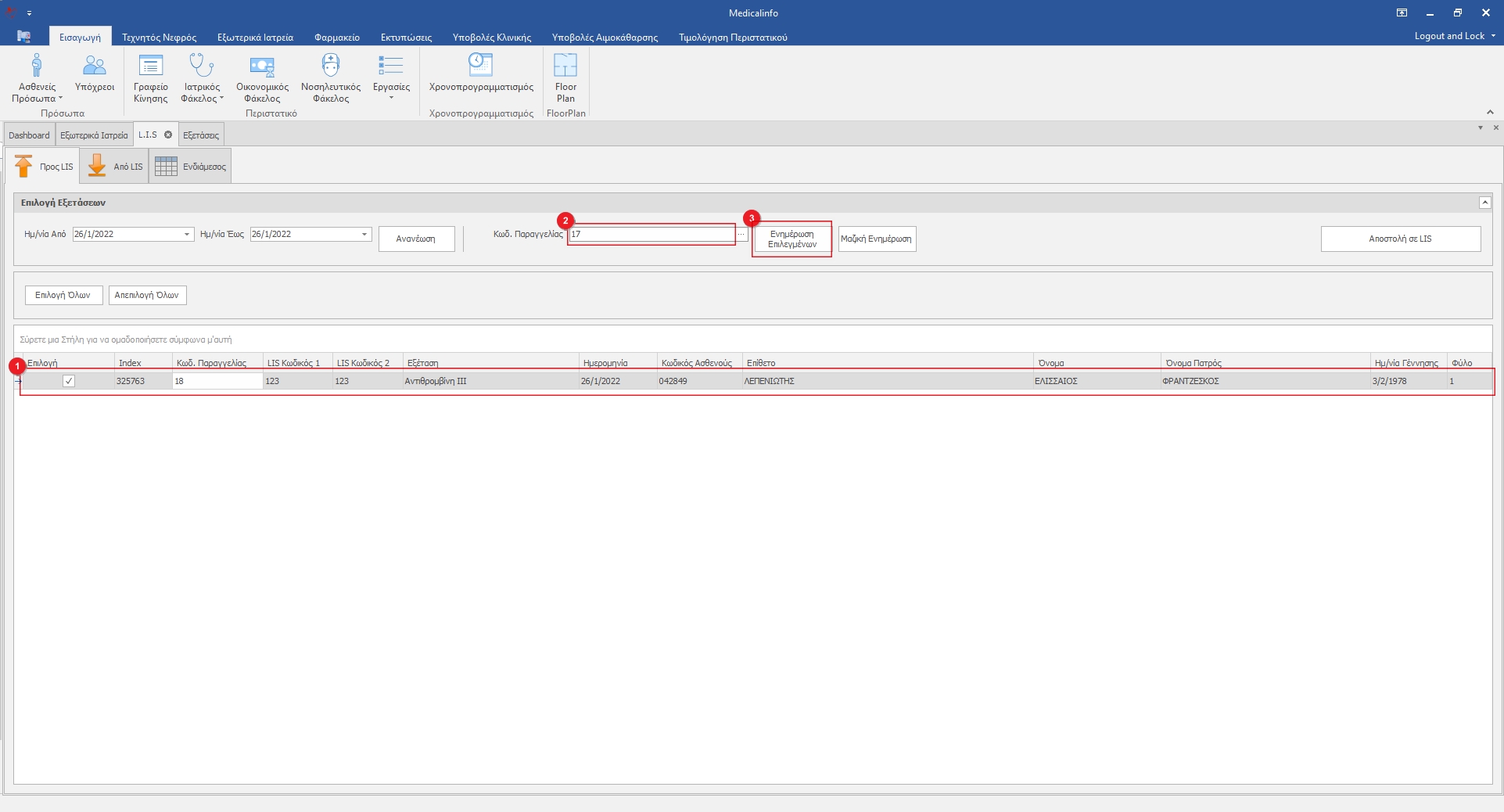 Στην καρτέλα Προς LIS επιλέγουμε την/τις εξέταση/εις(1), συμπληρώνουμε στο πεδίο Κωδ.Παραγγελίας(2) τον αριθμό που επιθυμούμε και κάνουμε κλικ στο κουμπί Ενημέρωση Επιλεγμένων(3).