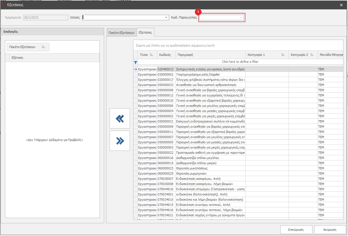 Στο παράθυρο καταχώρησης εξέτασης στο πεδίο Κωδ.Παραγγελίας(1) συμπληρώνουμε τον αριθμό που επιθυμούμε, επιλέγουμε τις εξετάσεις και Επικυρώνουμε.