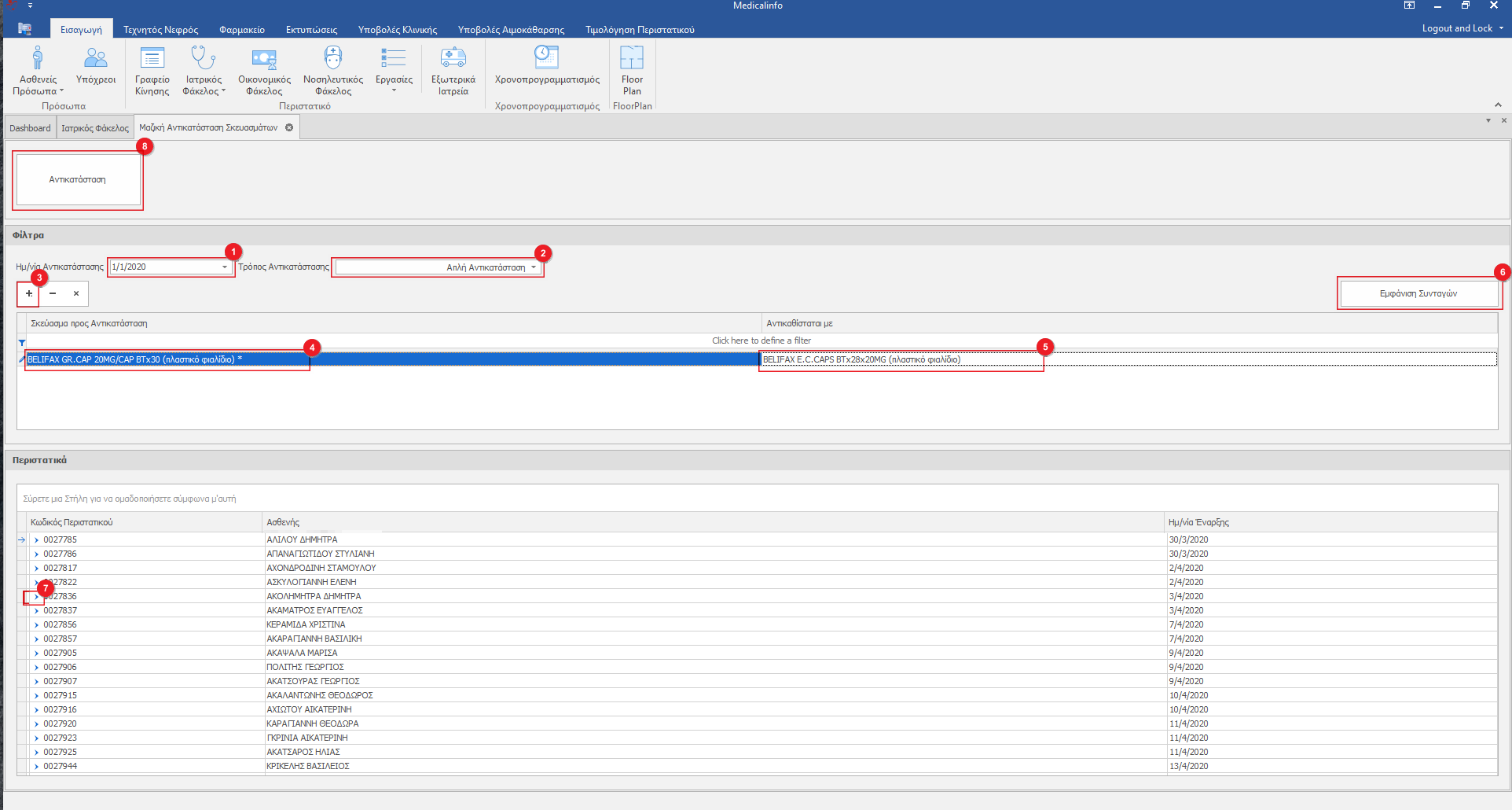 Αν δεν επιθυμούμε να γίνει αντικατάσταση σε ένα ή και περισσότερα από τα περιστατικά τότε κάνουμε κλικ στο βελάκι αριστερά του κωδικου περιστατικού(7) και πιέζουμε στο πληκτρολόγιο Delete.