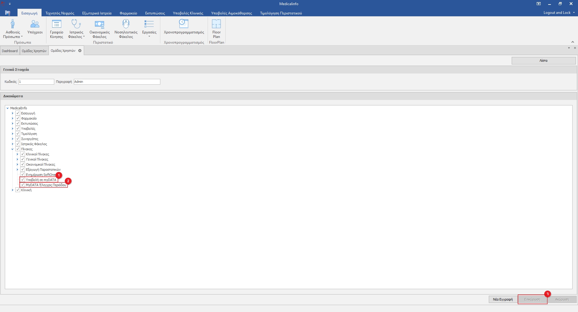 Για να αφαιρέσουμε το δικαίωμα από τις λειτουργίες διασύνδεσης με το MyData από την κατηγορία Πίνακες κάνουμε uncheck τα checkboxes Υποβολή σε myDATA(1) και MyDATA έλεγχος Περιόδου(2). Τέλος επικυρώνουμε(3) τις αλλαγές.