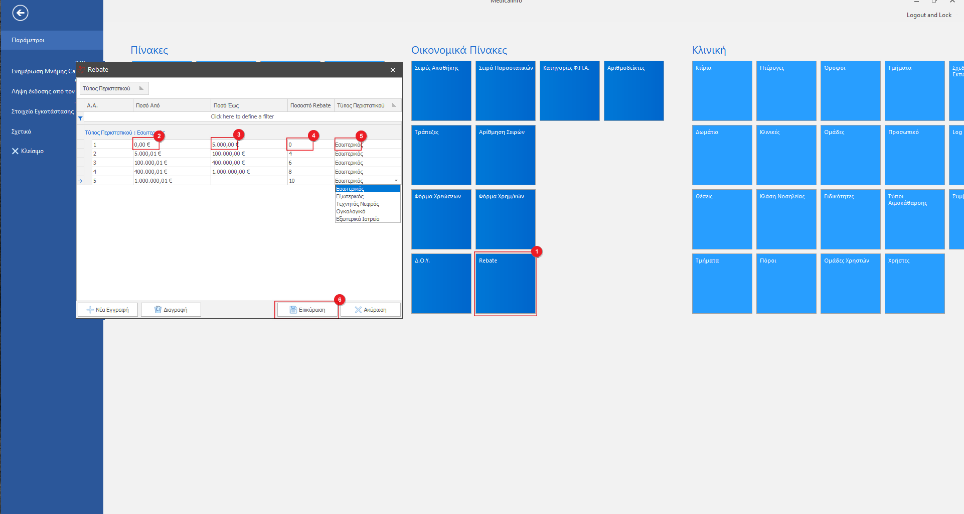 Συμπληρώνουμε τα πεδία με τα ποσά Από(2) , Έως(3), το ποσοστό Rebate(4) που αναλογεί στο εύρος τιμών που έχετε επιλέξει και τον Τύπο του περιστατικού(5) στον οποίο επιθυμείτε να υπολογίζεται το ποσοστό Rebate. Τέλος κάνουμε κλικ στο κουμπί Επικύρωση(6).