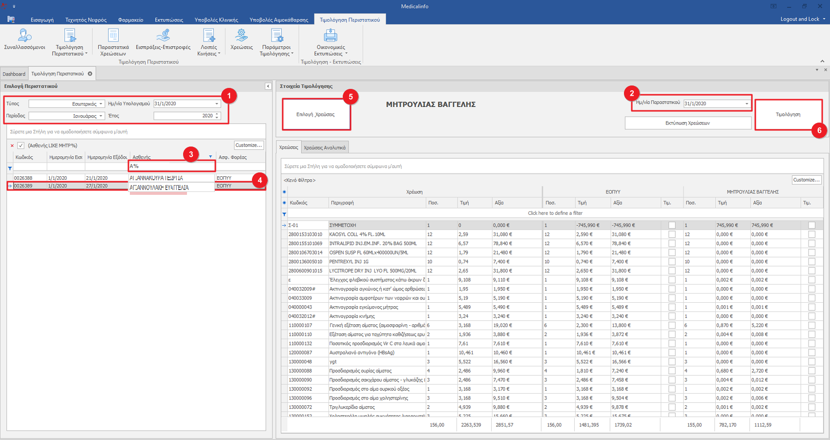 5. Κάνουμε κλικ στο κουμπί “Επιλογή Χρεώσεις. Στο κυρίως μέρος της οθόνης εμφανίζει τις χρεώσεις του περιστατικού διαχωρισμένο σε χρεώσεις προς ΕΟΠΥΥ και στου Ασθενή.