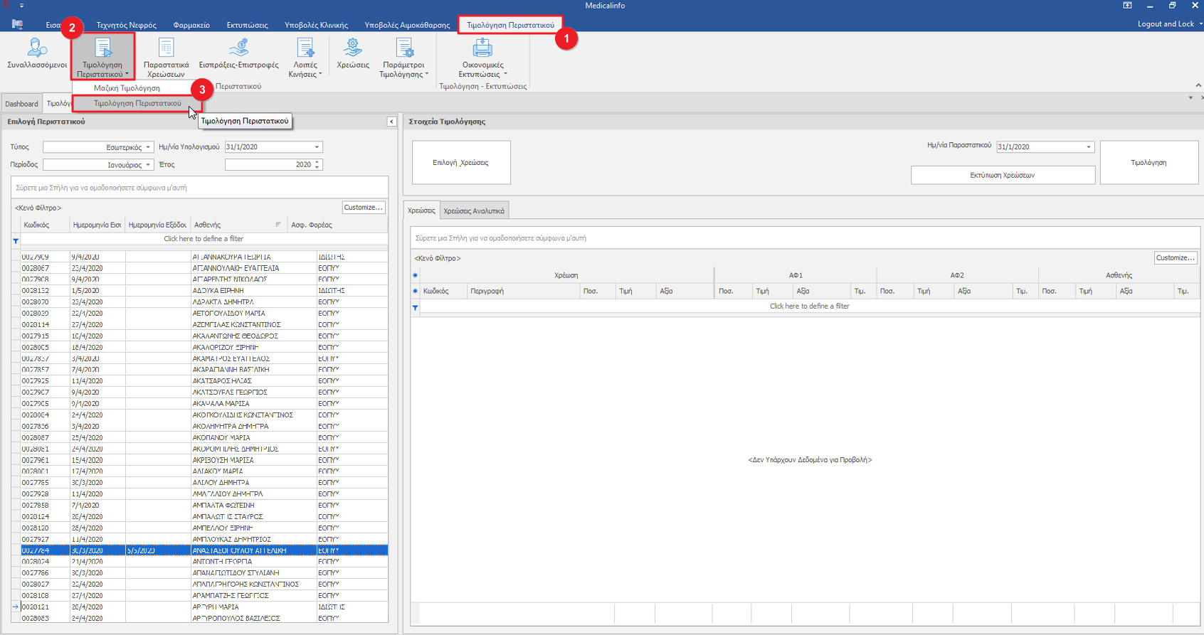 Κάνουμε κλικ στο μενού Τιμολόγηση Περιστατικού(1), από την Τιμολόγηση Περιστατικού(2) επιλέγουμε Τιμολόγηση Περιστατικού(3).