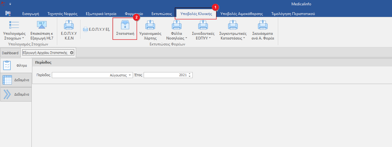 Υποβολές Κλινικής(1) και επιλέγουμε την καρτέλα Στατιστική(2).