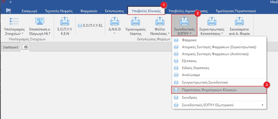 Στην καρτέλα Υποβολές Κλινικής (1) κλικάρουμε το κουμπί Συνοδευτικές ΕΟΠΥΥ(2) και από το drop down μενού επιλέγουμε Παρατάσεις Ψυχιατρικών Κλινικών(3).