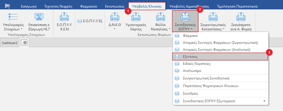 Στην καρτέλα Υποβολές Κλινικής (1) κλικάρουμε το κουμπί Συνοδευτικές ΕΟΠΥΥ(2) και από το drop down μενού επιλέγουμε Εξετάσεις(3).