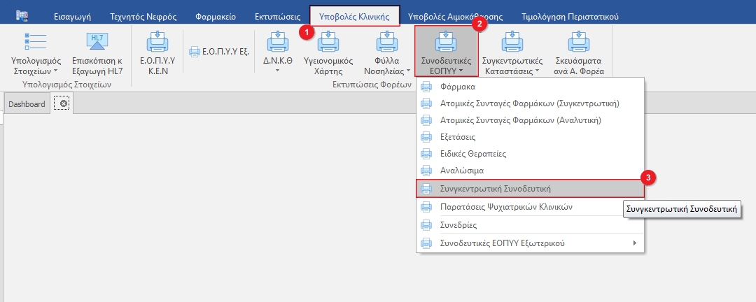 Στην καρτέλα Υποβολές Κλινικής (1) κλικάρουμε το κουμπί Συνοδευτικές ΕΟΠΥΥ(2) και από το drop down μενού επιλέγουμε Συγκεντρωτική Συνοδευτική(3).