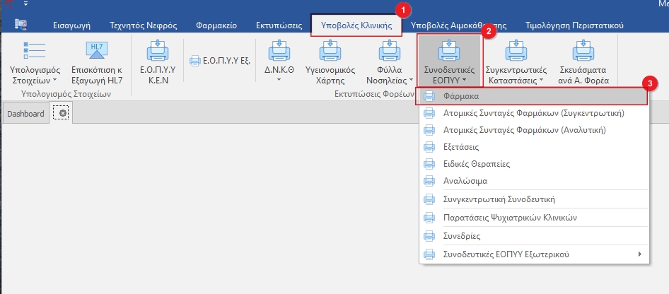 Στην καρτέλα Υποβολές Κλινικής (1) κλικάρουμε το κουμπί Συνοδευτικές ΕΟΠΥΥ(2) και από το drop down μενού επιλέγουμε Φάρμακα(3).